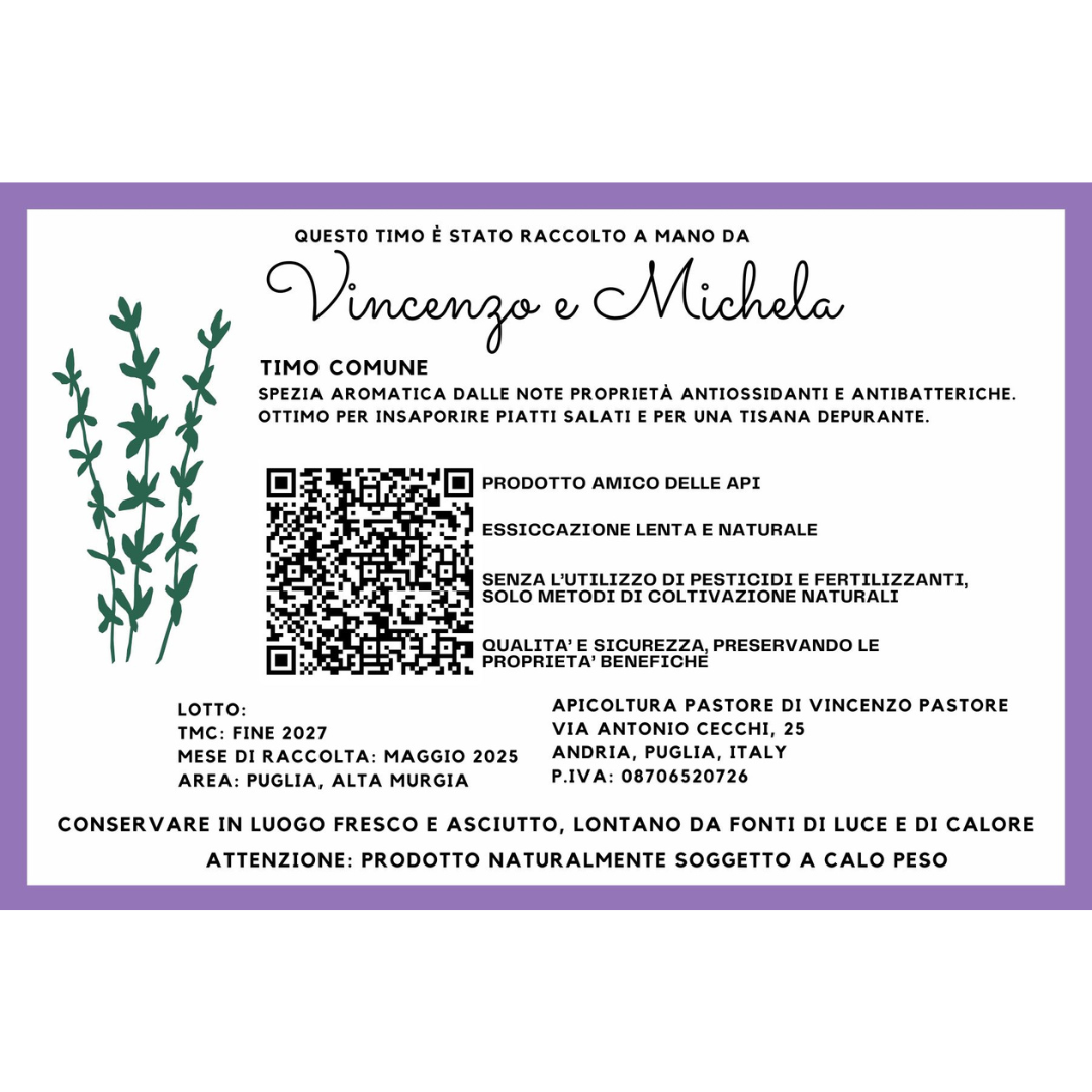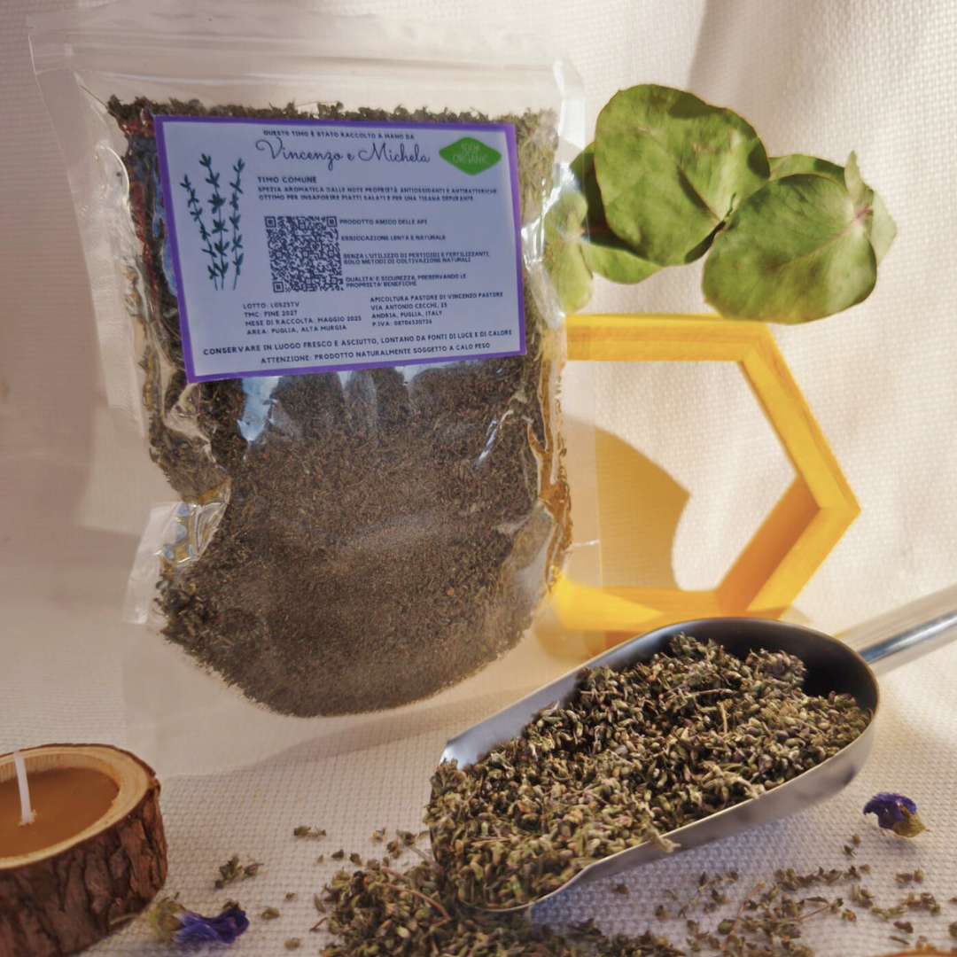 Riscopri l'essenza selvatica e il profumo mediterraneo della Puglia con il nostro timo officinale. Coltivato seguendo i ritmi della natura nell'altopiano della Murgia, questo timo beneficia di un terreno calcareo e di un'esposizione solare unica che ne concentrano gli oli essenziali. Raccolto nel momento balsamico mantiene intatta la sua fragranza pungente e le sue proprietà benefiche. Ideale per arricchire tisane, oleoliti o per donare un tocco aromatico e autentico alle tue ricette di carne, pesce e verdure.