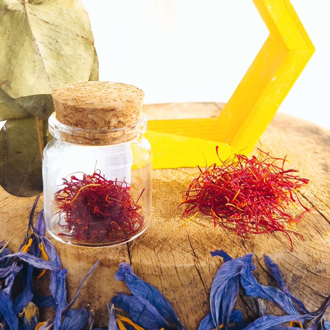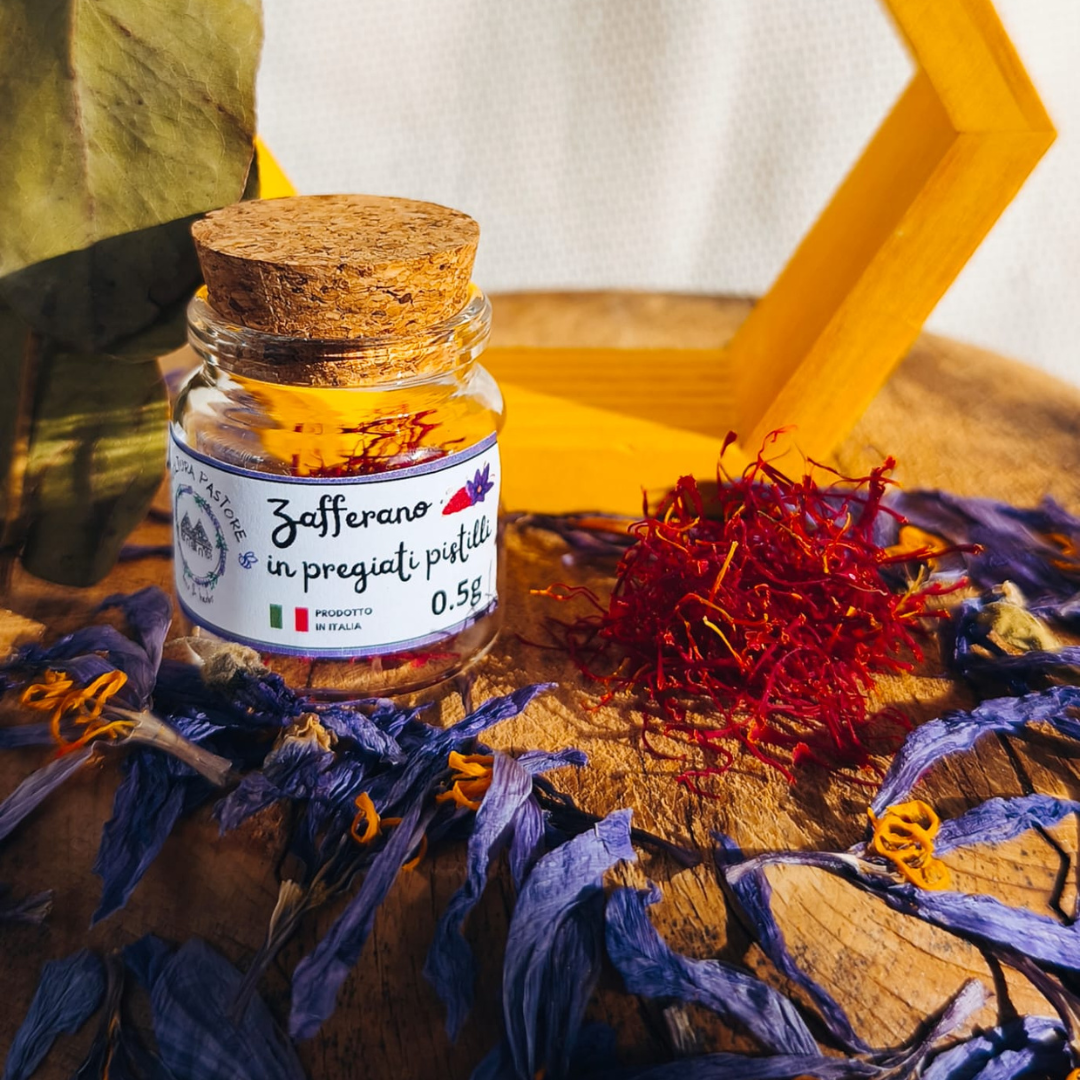 Zafferano in pregiati pistilli, raccolto a mano, prodotto sulle colline del Parco Nazionale dell'Alta Murgia, ai piedi del maniero federiciano Castel del Monte, Andria. Vasetto da 0,5 Grammi.